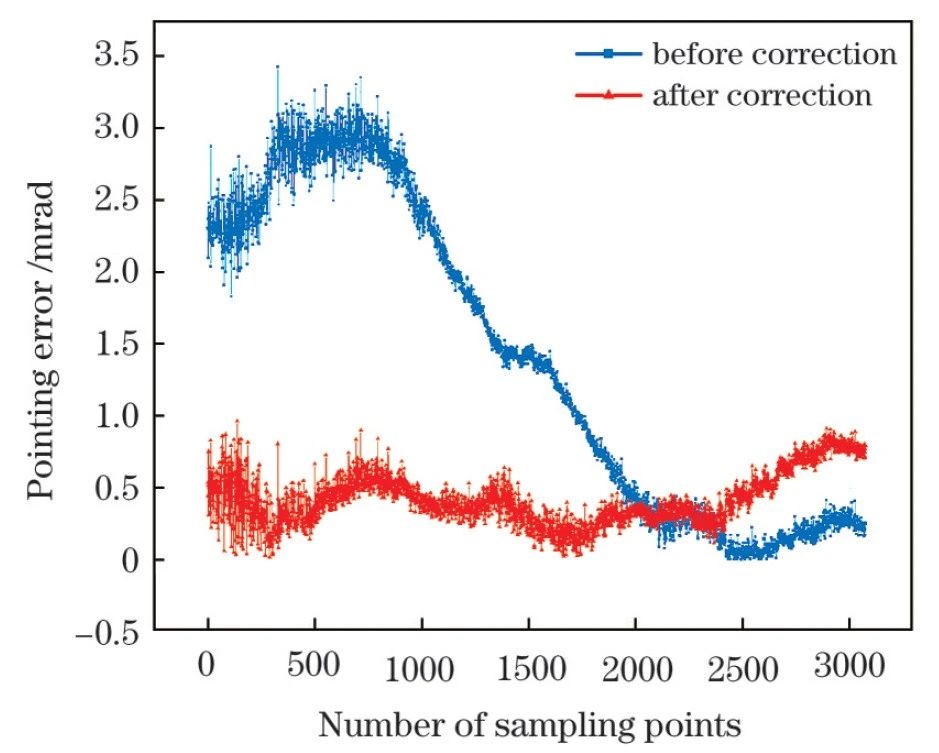 上海光學精密機械研究所侯霞、魯紹文團隊針對星載激光通信中快速建鏈的應用需求,提出了一種基于參數尋優的激光通信終端指向在軌快速標校方案。該方案綜合應用復雜的坐標系轉換和誤差修正矩陣,實現了對理論指向矢量的高精度修正,采用了斐波那契查找算法結合最小二乘法的尋優策略,提高了標校過程的收斂速度和精度,實現了對激光通信終端光軸的快速、精確標校。修正后的指向誤差結果如圖1所示,最小0.02 mrad,大0.81 mrad,平均誤差為0.42 mrad。